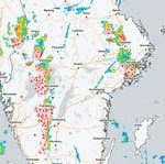 På SMHI:s radarkarta syns ett bälte över Götaland och Svealand med många blixtnedslag.