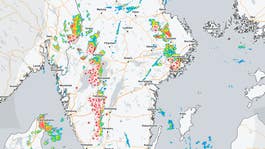 På SMHI:s radarkarta syns ett bälte över Götaland och Svealand med många blixtnedslag.