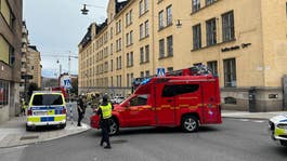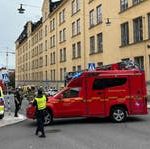 En mc-förare blev fastklämd under en buss i samband med en flerfordonskrock på Södermalm i Stockholm på torsdagseftermiddagen.