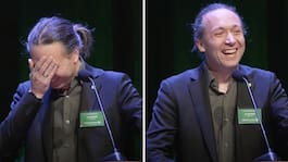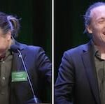 Miljöpartiets valförrättare Jon Karlfeldt lockade oavsiktligt publiken till skratt tillkännage resultatet av språkrörsvalet.