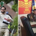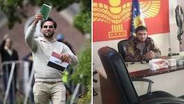 I centrum står Salwan Momika som brände och fördömde Koranen i Stockholm – och en folkmassa brände svenska ambassaden i Irak i protest.