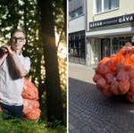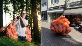 Under lördagen bar konstnären Mattias Käll på 60 kilo plast, fördelat i 118 påsar, genom centrala Jönköping.