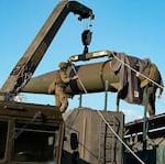 Propagandan visar upp bilder på lastbilar lastade med robotar som åker in på ett fält.