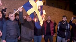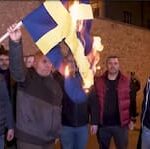 Turkiska demonstranter bränner svenska flaggan som en motaktion mot lördagens koranbränning i Stockholm.